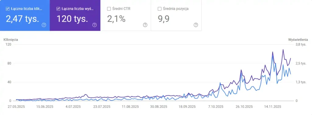 - Kliknięcia z Google: Wzrost z 9 do prawie 400 miesięcznie (wzrost o ponad 4000%).